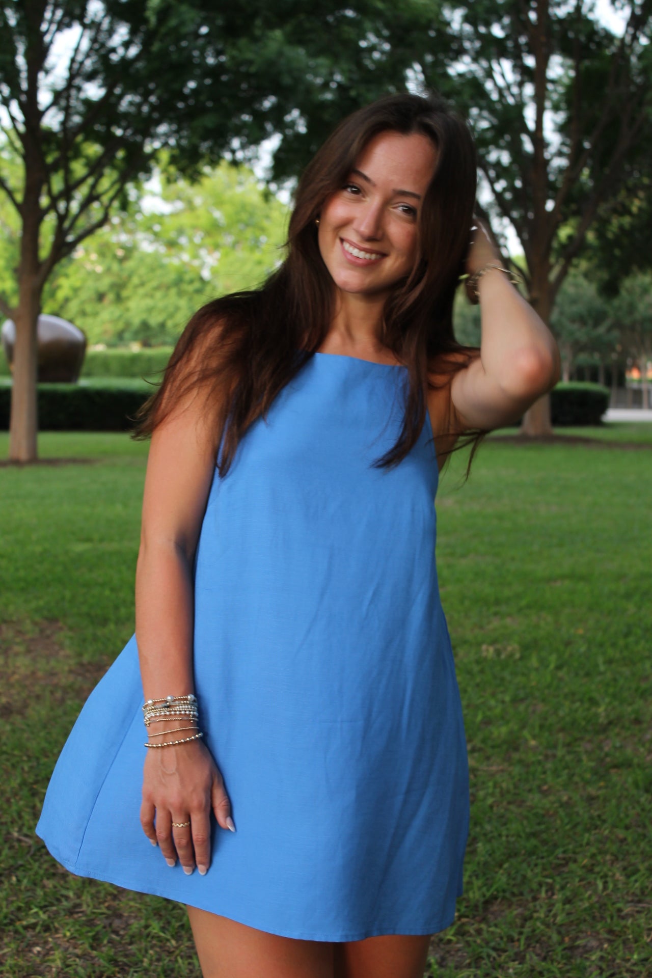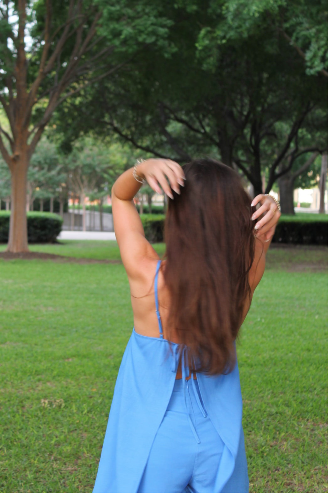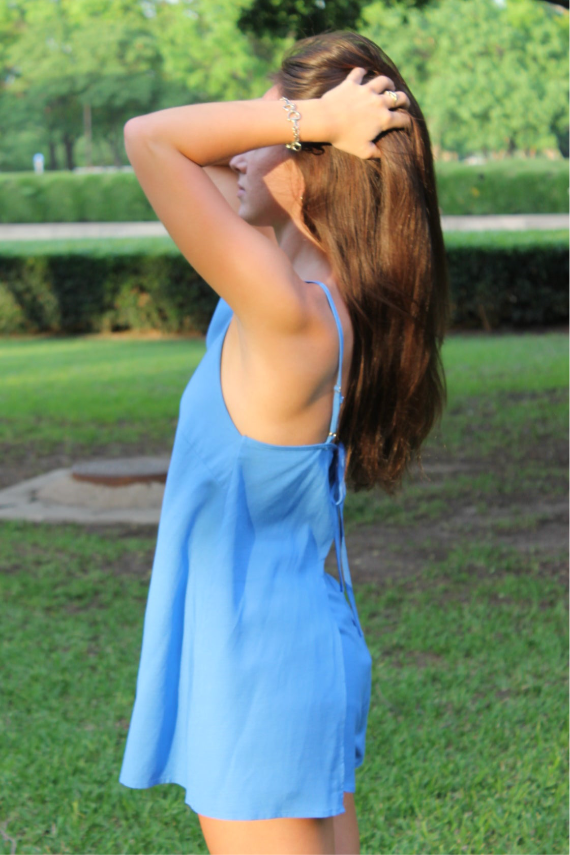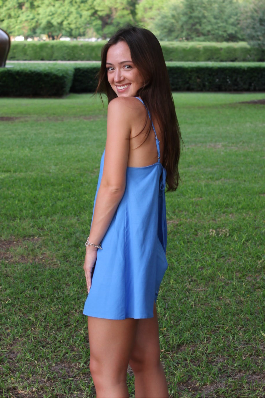Blue One-piece Romper with Spaghetti Straps. a Tied Back, and Zip Up Shorts