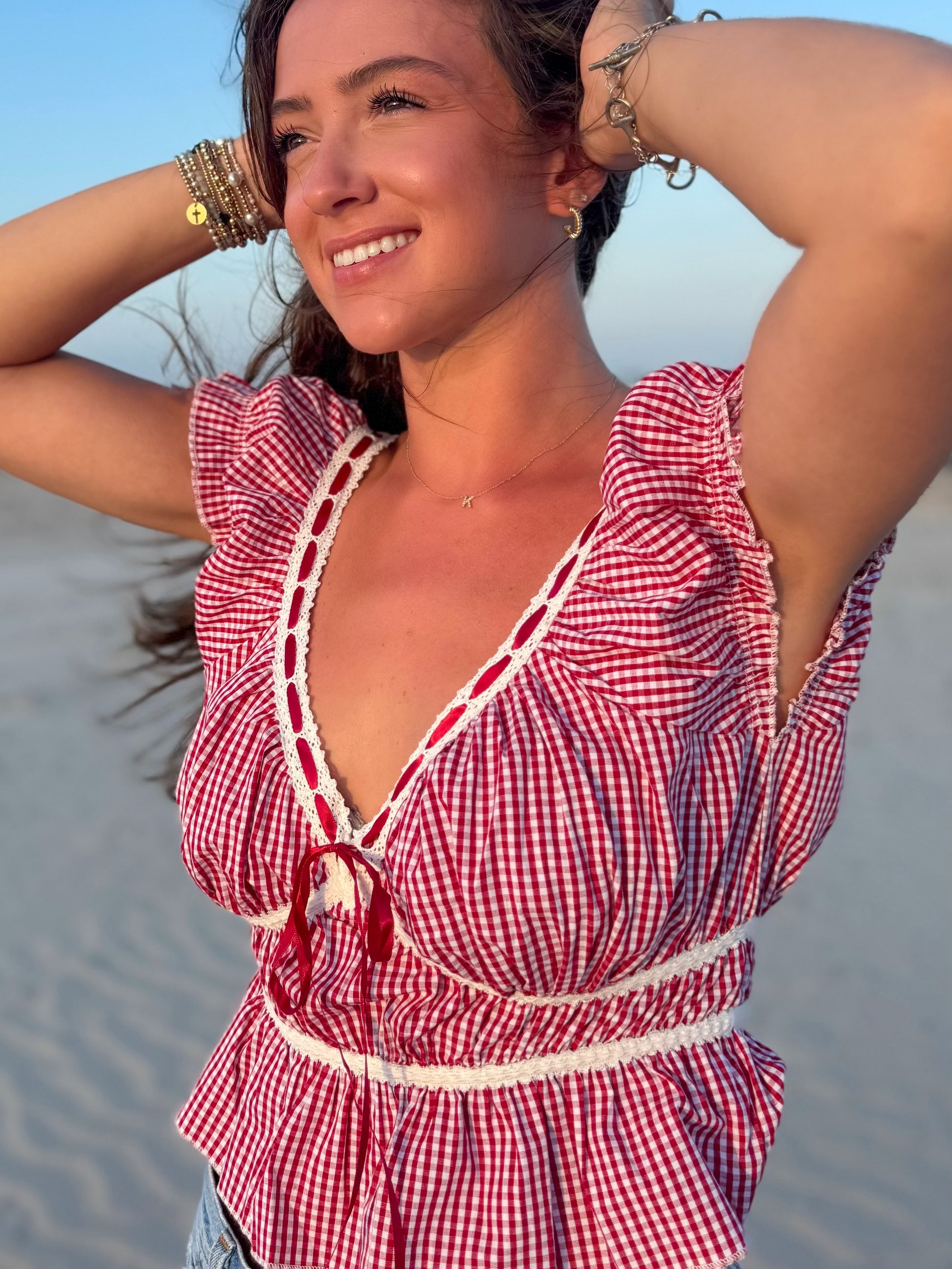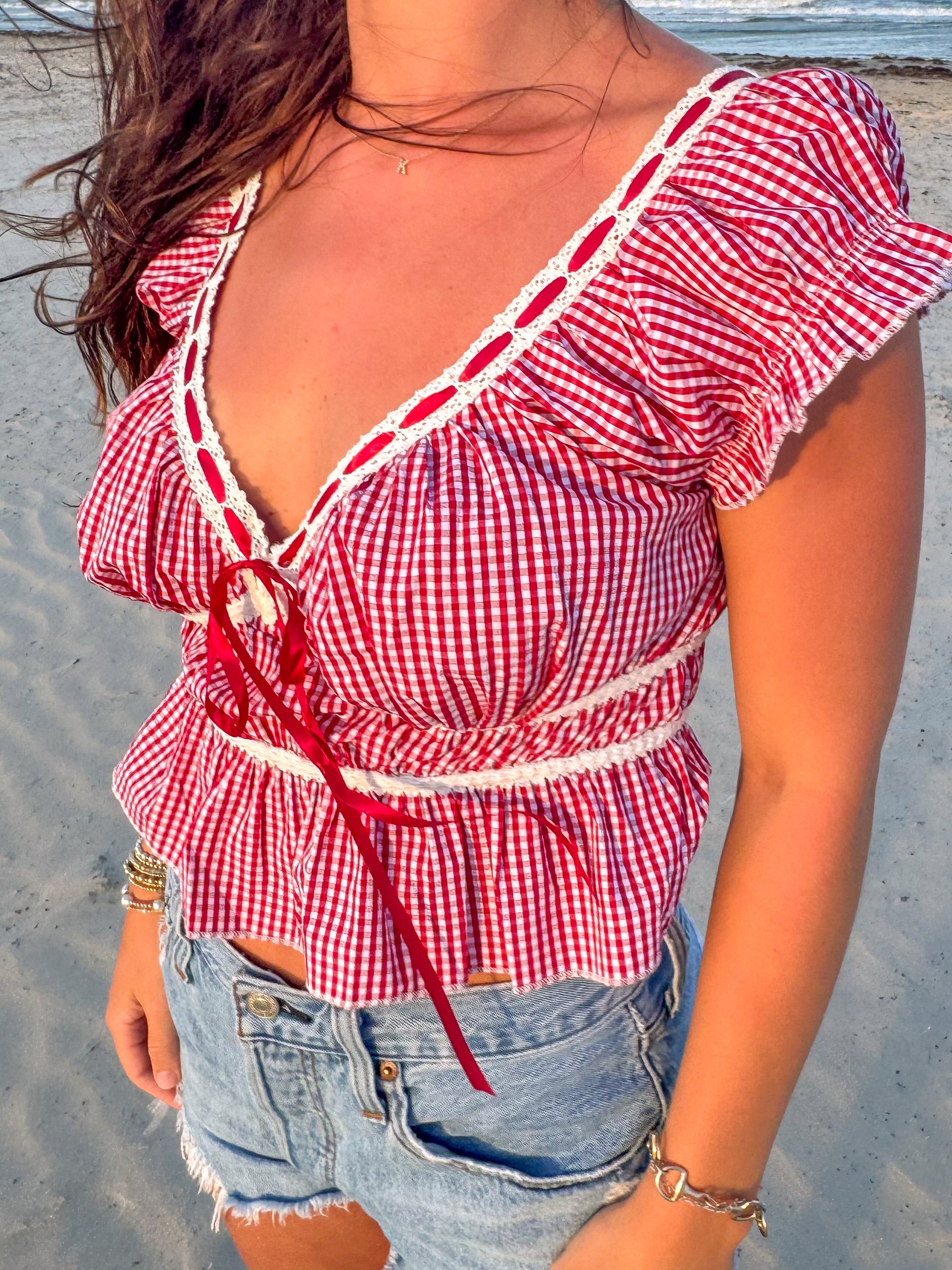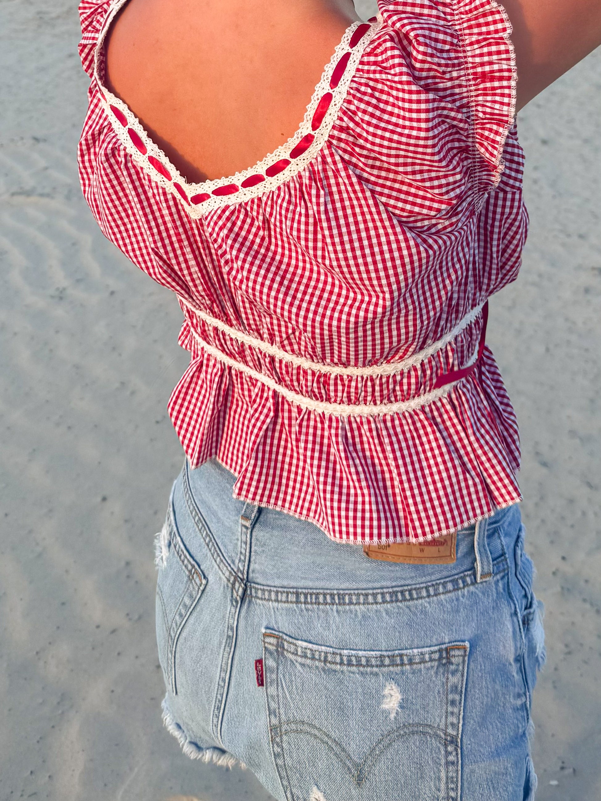 Red and White Gingham Tie Top