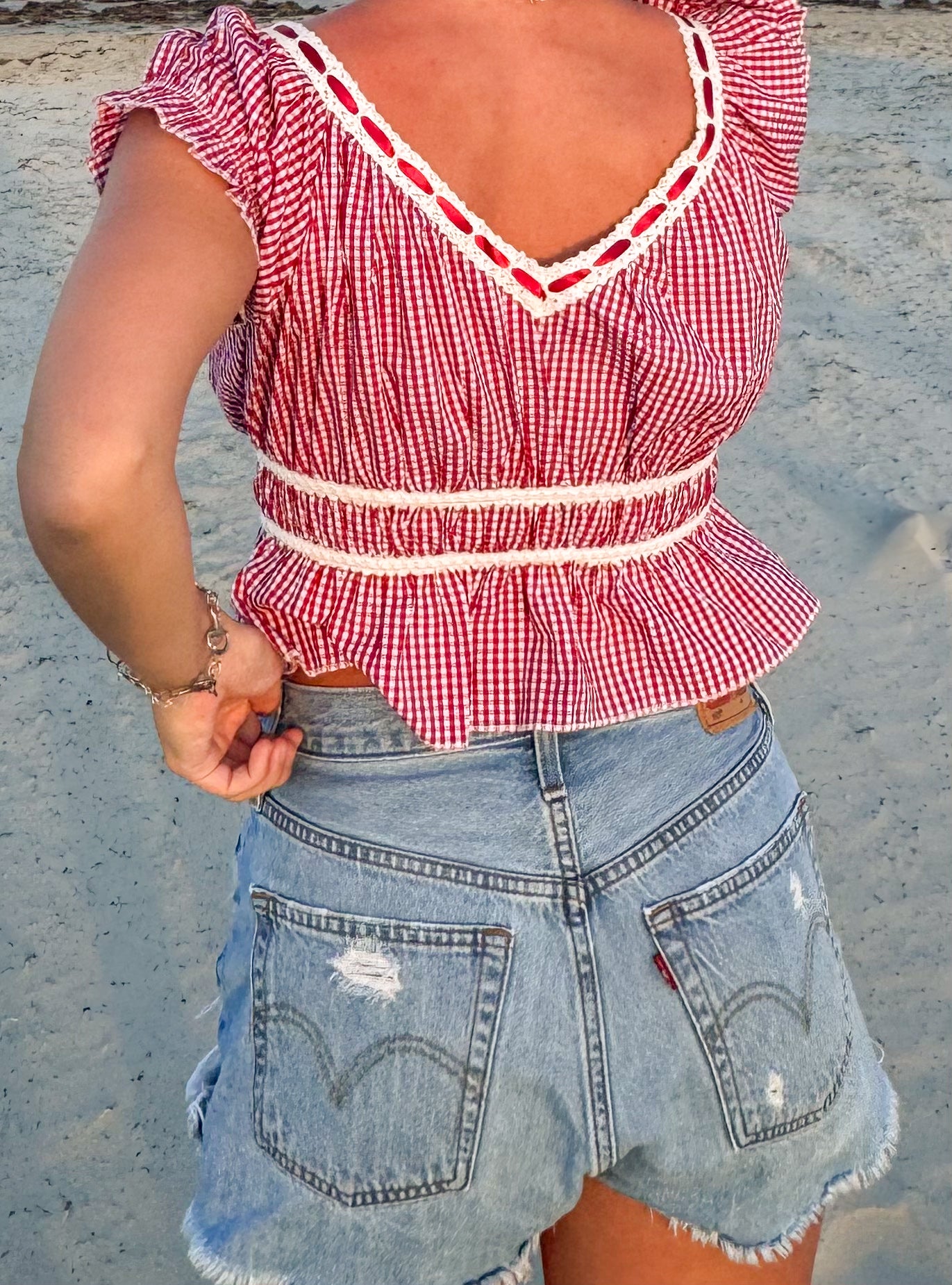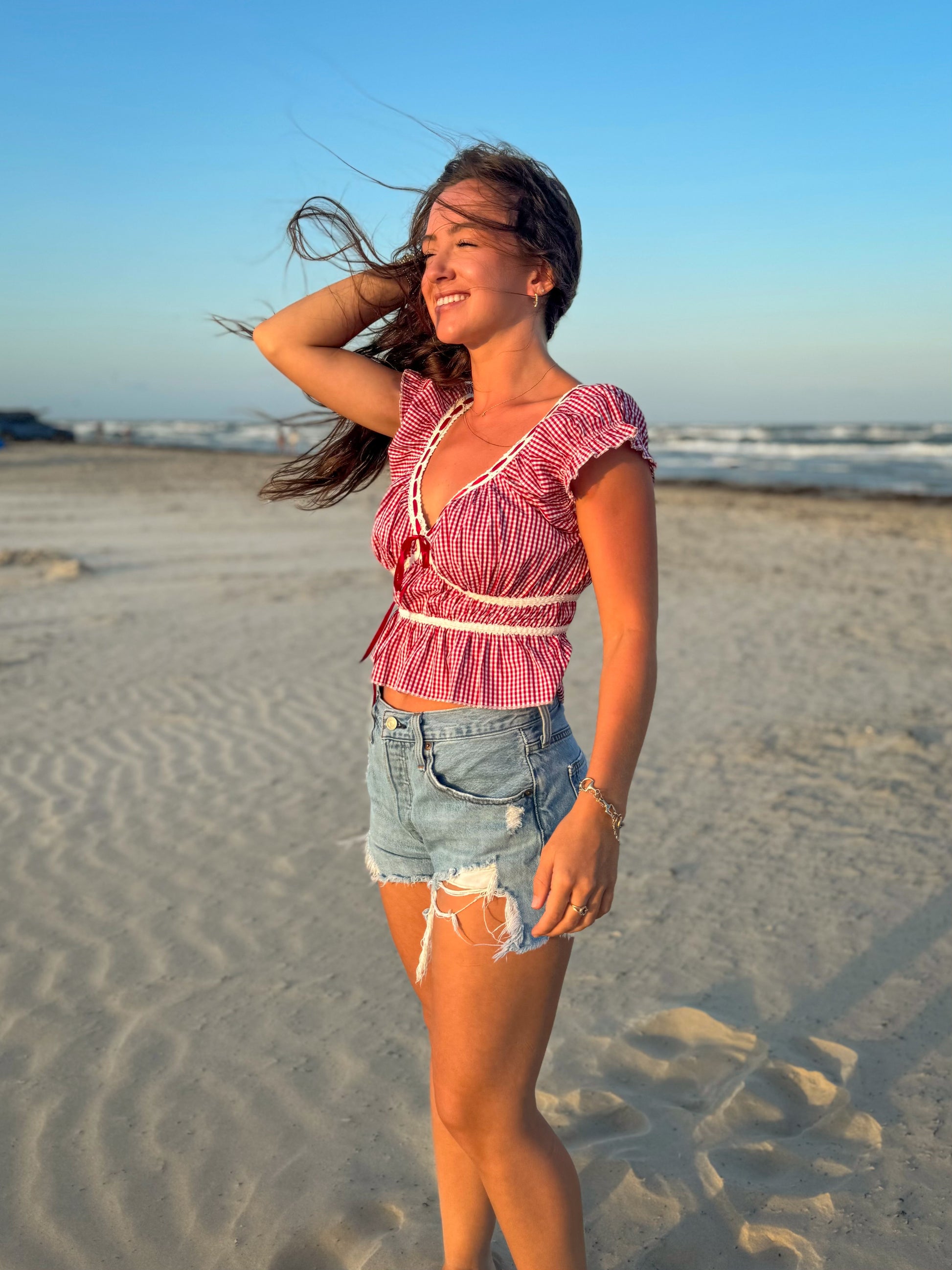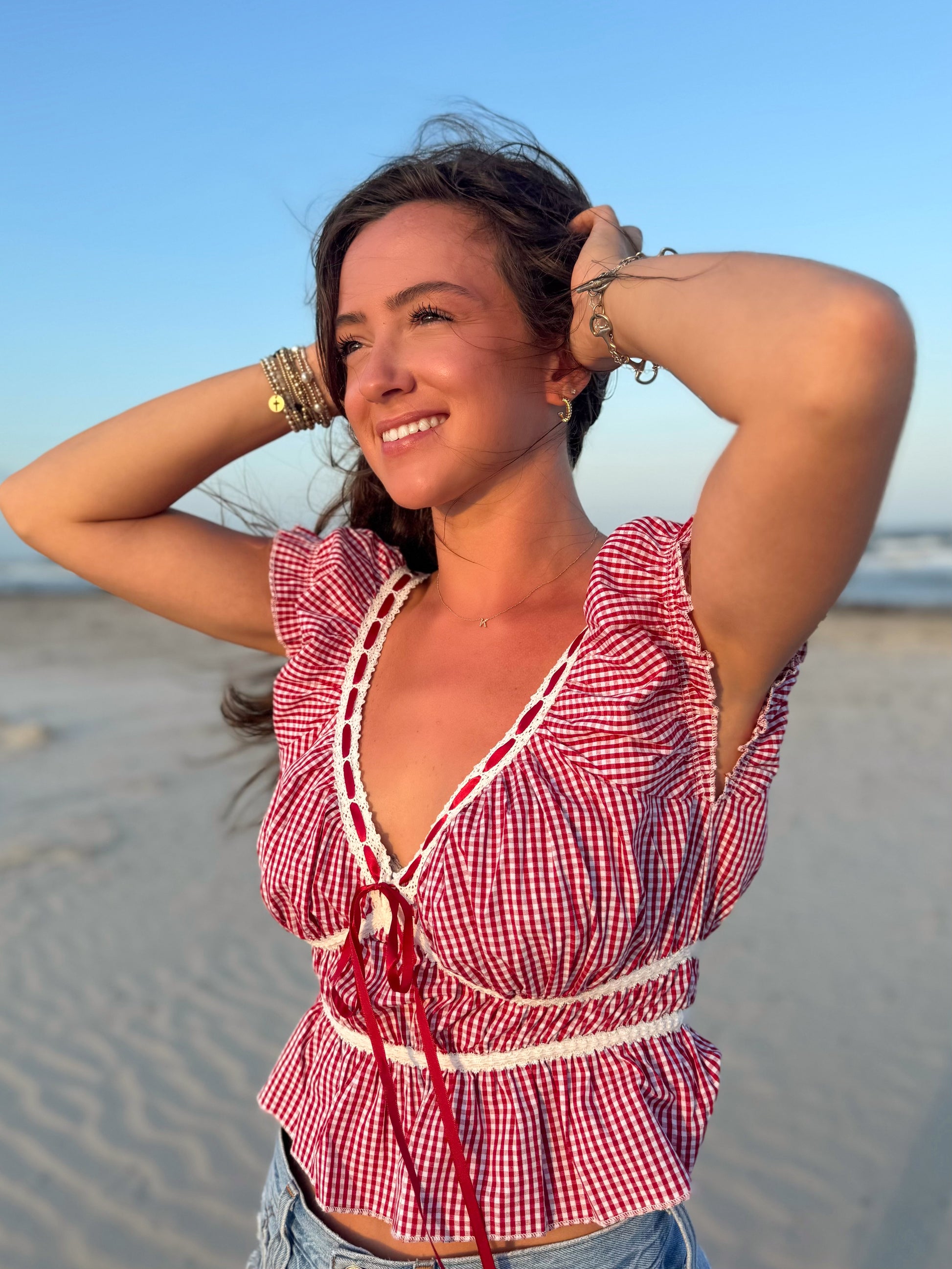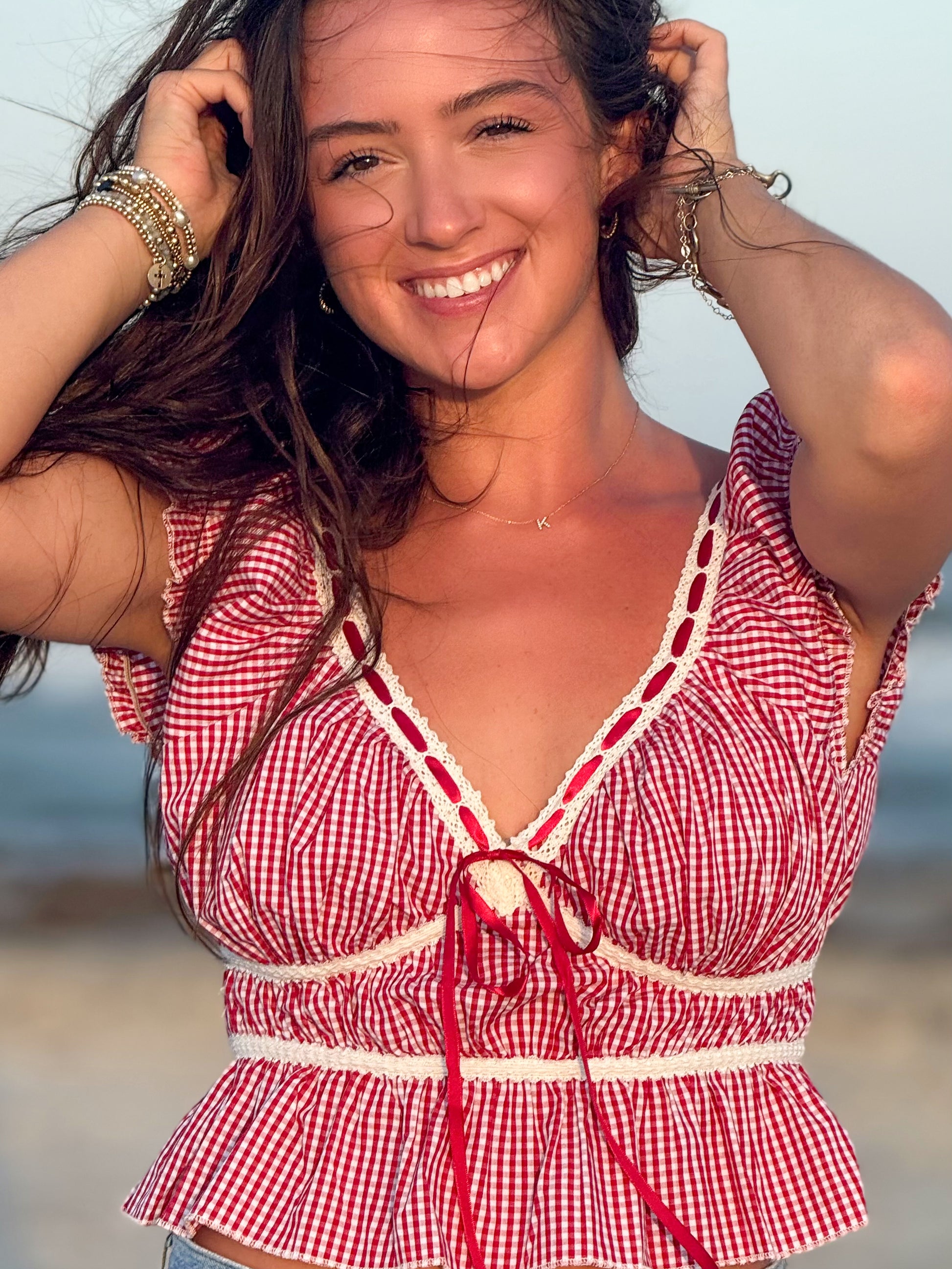 Red and White Gingham Tie Top